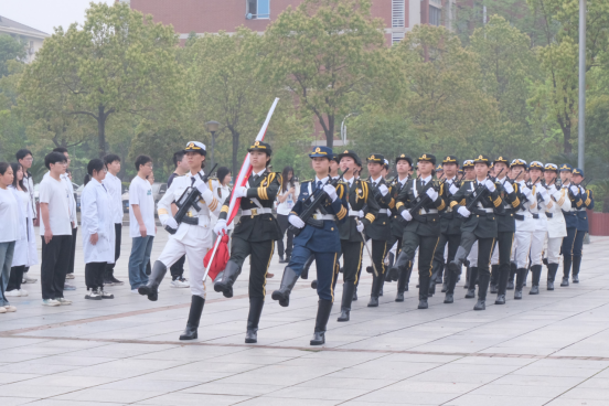 铿锵有力的步伐声响起,校员工纠察队国旗班方阵出旗。在庄严肃穆的国歌声中,全体师生对缓缓升起的国旗行注目礼。