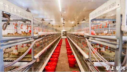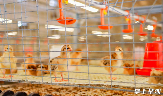 刚一进去,暖意便扑面而来。明亮整洁的鸡舍中,一只只羽翼未丰的白羽雏鸡纷纷将头伸向笼外啄食。