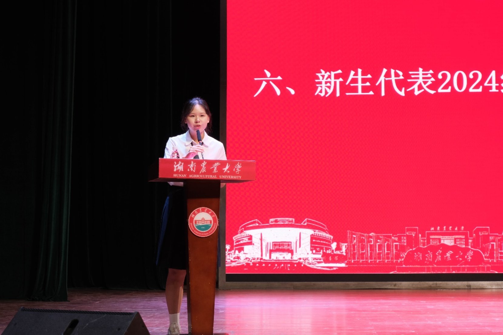 2024级动科九班许裕晗同学作为新生代表发言,她分享了自己初入大学的体验与感悟,倡议同学们脚踏实地、勤勉自强,做坚守奋斗的合格湘农动科人;用心动脑、求实探索,做求知勉行的优秀湘农动科人;勇于攀登、创新进取,做永不服输的卓越湘农动科人。