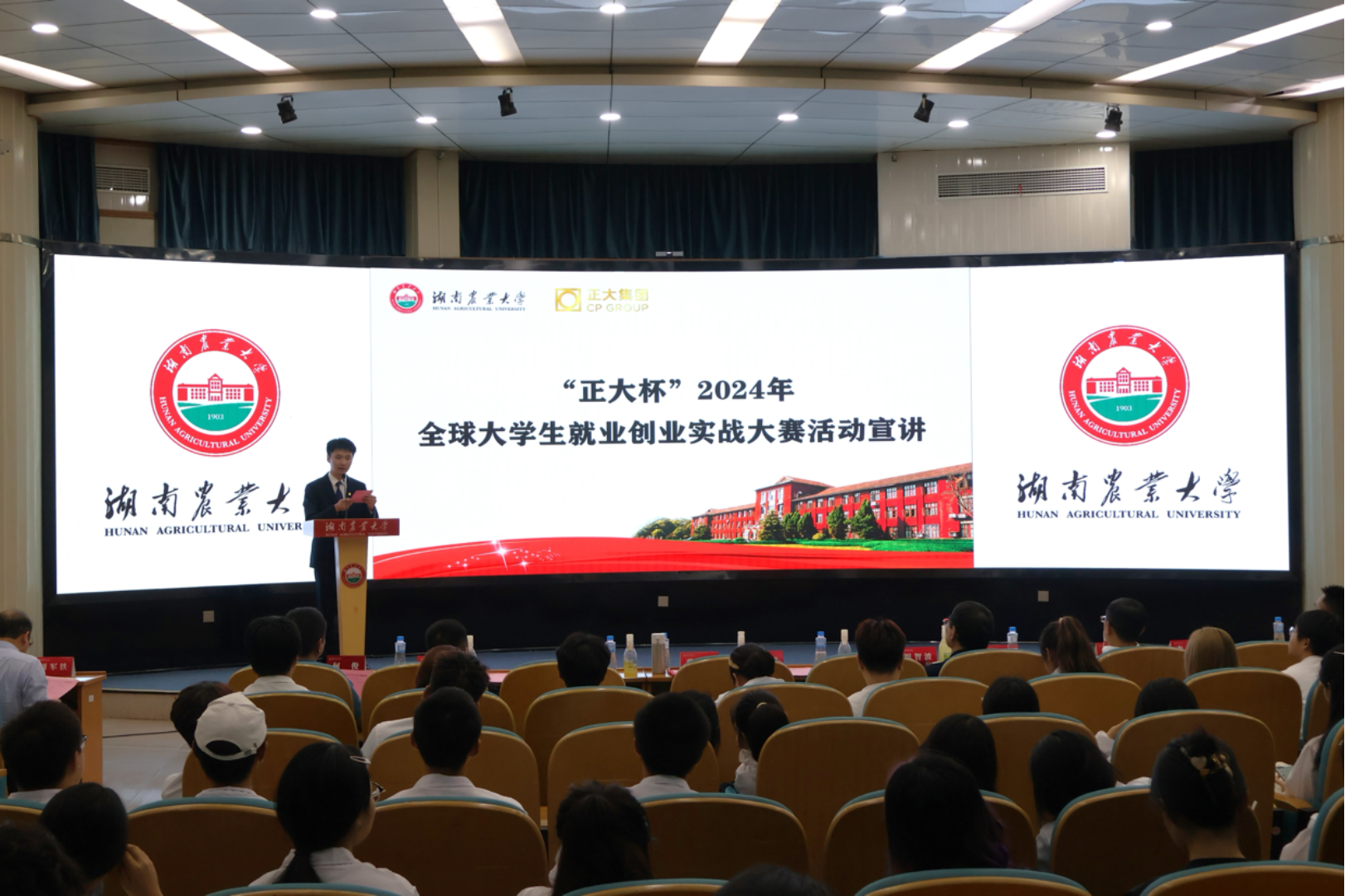 活动的最后,正大集团就“正大杯”2024年全球老员工就业创业实战大赛活动做了宣讲。该项赛事由正大集团举办,致力于发现和培养具有创新思维与商业能力的优秀人才,为每一位勇于探索,不懈追求的学子提供广阔的平台,共设有实战营销、数字创新、食品研发、健康养殖四条赛道。今年的“正大杯”赛事全面升级成为全球老员工创业大赛,获胜的金奖团队均有机会前往泰国正大集团总部游学,与国际友人同台竞技交流。