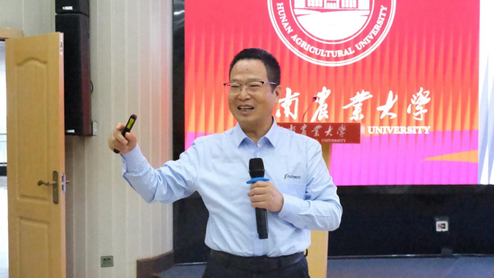 泰高集团中国总经理杨剑青介绍了泰高集团的历史、业务方向及其世界前沿专业优势,并指出目前中国畜牧业需要资金和技术两个重要资源,动物营养在社会资源的优化再分配和精准的营养可持续发展方面有极大的进步空间。最后,他表示十分期待与湖南农大师生携手,共同推进中国畜牧业发展。