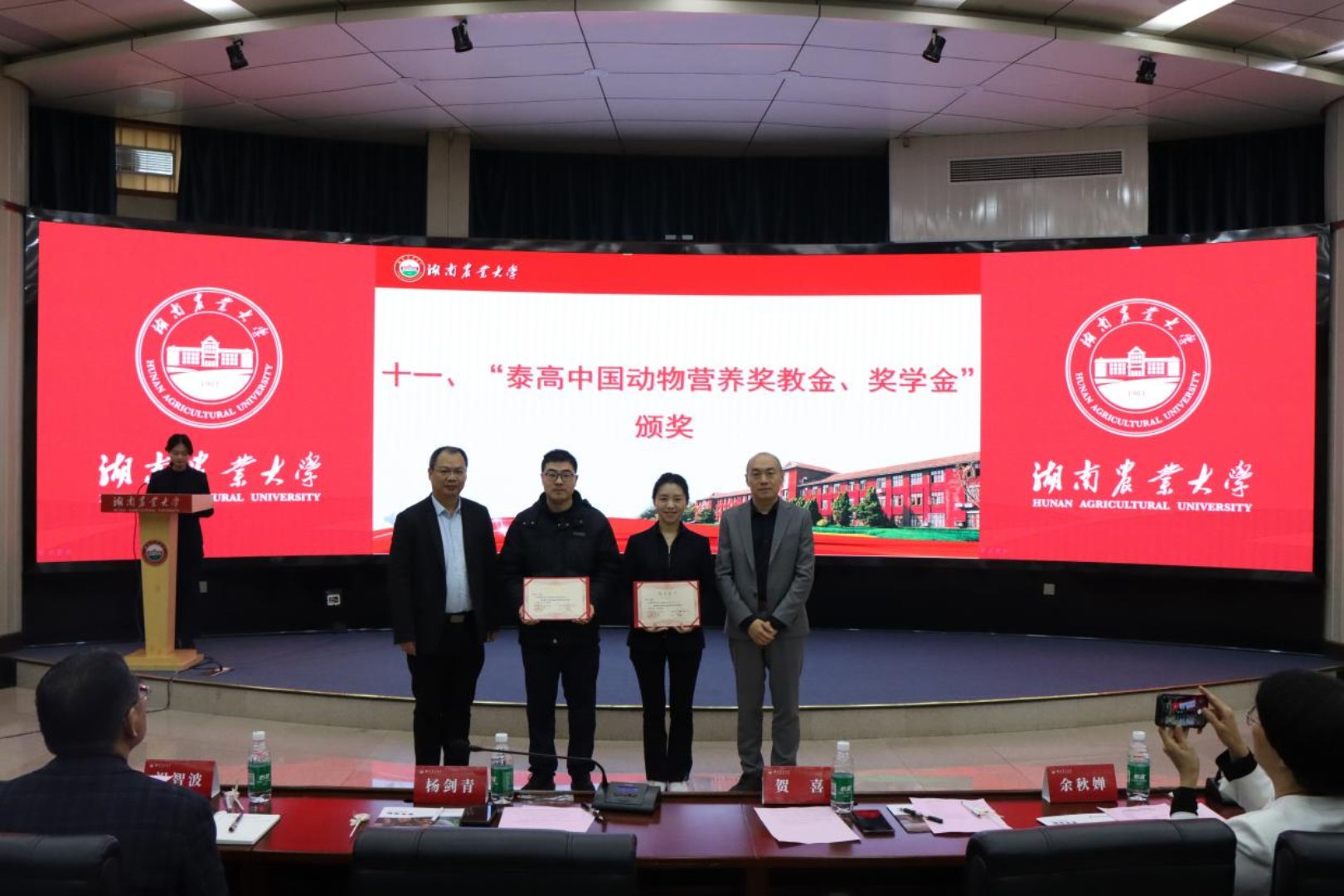 随后,公司党委书记祖智波宣读“泰高中国动物营养奖教金、奖学金”获奖名单,泰高集团中国总经理杨剑青和公司经理贺喜为获奖教师颁奖,泰高集团技术市场总监石满仓和公司党委书记祖智波为获奖研究生颁奖,泰高集团中国区人力资源总监余秋婵和公司副经理何俊为获奖本科生颁奖。