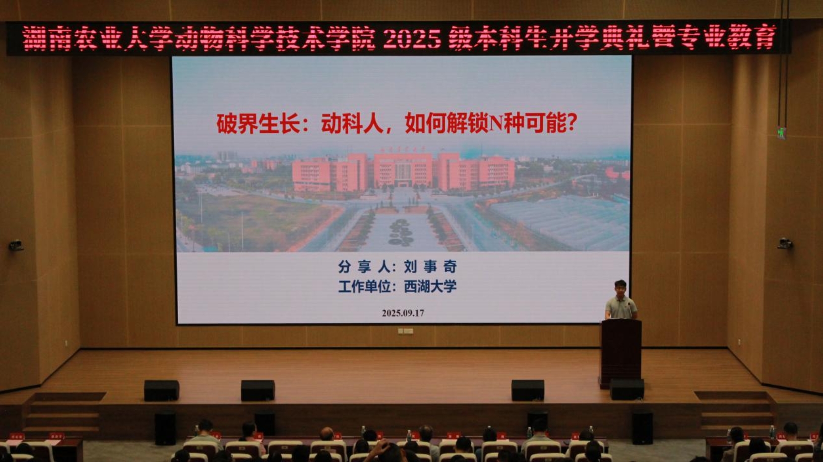 开学典礼第二阶段,公司特邀杰出员工、西湖大学博士后刘事奇老师作专业教育讲座。刘事奇老师以《破界生长:动科人,如何解锁 N 种可能?》为题,结合自身9年动科求学与成长历程,打破“动科仅涉饲料养殖”的认知局限,阐释专业在生命密码解读、未来食品研发等领域的多元价值,分享从大一迷茫到明确目标、深耕学业最终保送浙大的蜕变故事,并为新生给出实用建议。