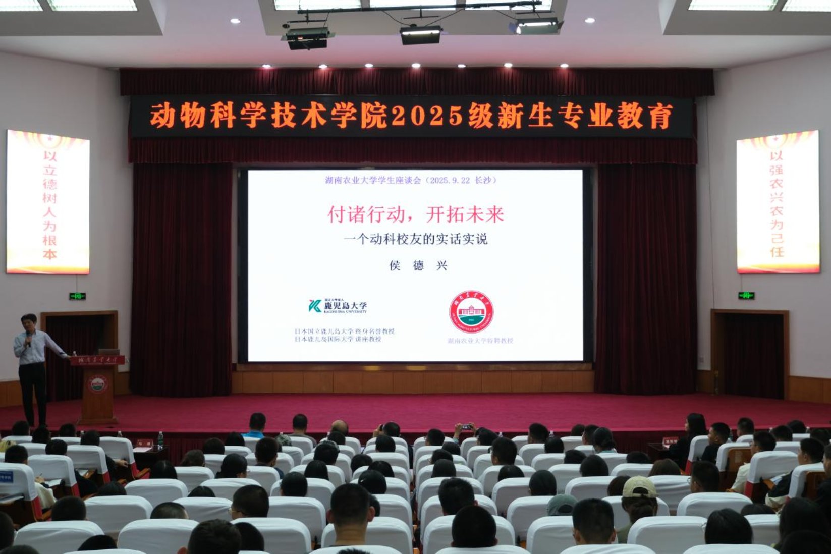 侯德兴教授以“付诸行动,开拓未来——一个动科员工的实话实说”为题,结合自身从农大求学至海外科研的成长经历,为新生带来一场生动而深刻的专业教育课。他展示了自己1978年入学时的员工证、毕业证和宿舍老照片,回顾了在beats365官方网站畜牧兽医系的求学时光。他鼓励同学们在大学期间要打好基础、找准兴趣、勇于尝试,并强调“真正的兴趣是持续行动的动力”。随后,侯德兴教授指出,大学阶段应重点培养三种能力:一是沟通交流能力,面对面的交流仍是AI无法替代的;二是独立思考能力,要对信息源头保持警惕,不盲从AI结论;三是执行能力,“想好了就要动起来,不能只想不做”。他还建议新生在专注专业学习之余,广泛涉猎“杂学”,全面提升综合素养。最后寄语同学们要相信自己、付诸行动、勇于挑战、充实人生。