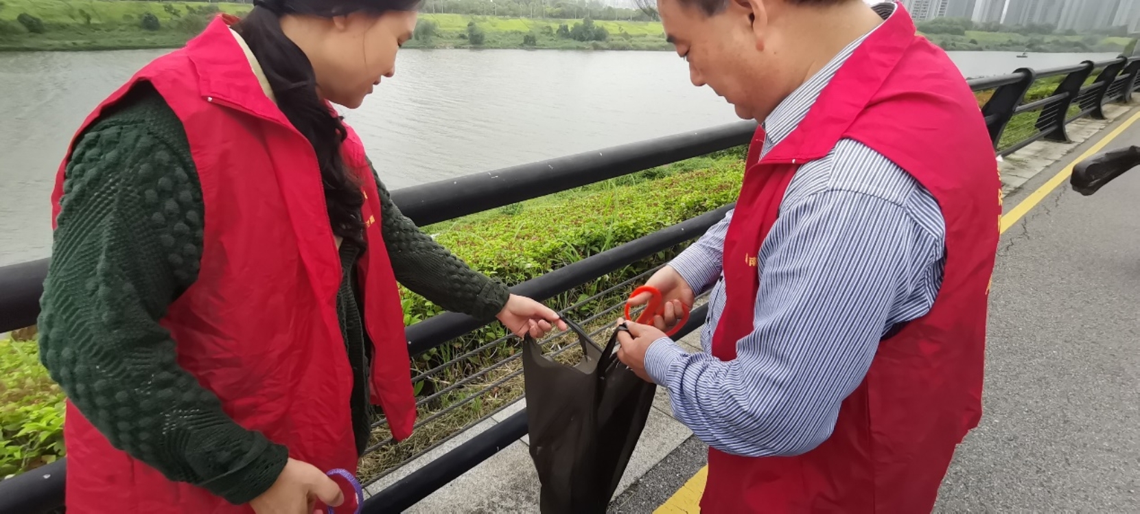 秋日的浏阳河畔,水清岸绿,景色宜人。活动中,党员教师们身着志愿者服装,手持垃圾袋与清洁工具,沿河岸系统清理草丛、步道中的塑料袋、烟蒂、纸屑及塑料瓶等滞留垃圾。大家分工协作,默契配合,以实际行动维护河道环境整洁,展现出高校教师党员服务社会、爱护环境的良好风貌。