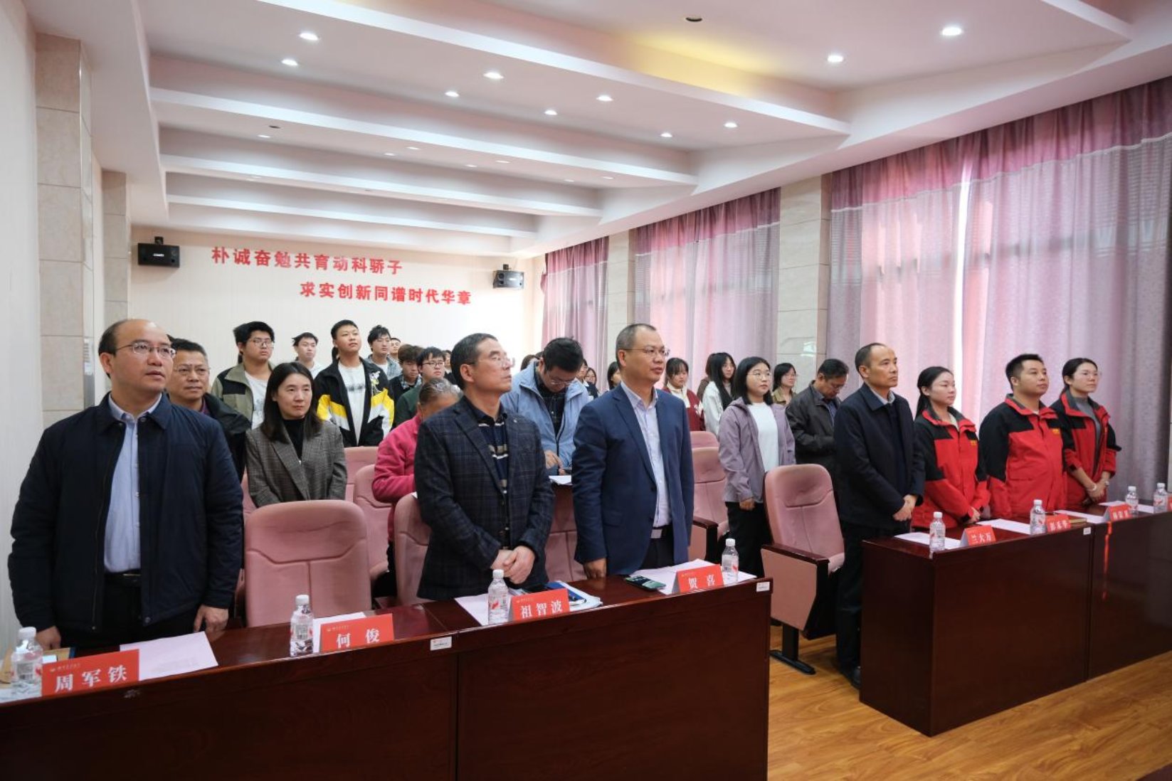 成立仪式在全体起立、奏唱校歌中拉开帷幕。