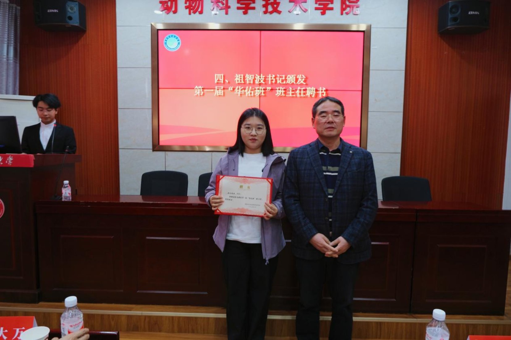 祖智波为第一届“华佑班”班主任欧阳清渊老师颁发聘书。