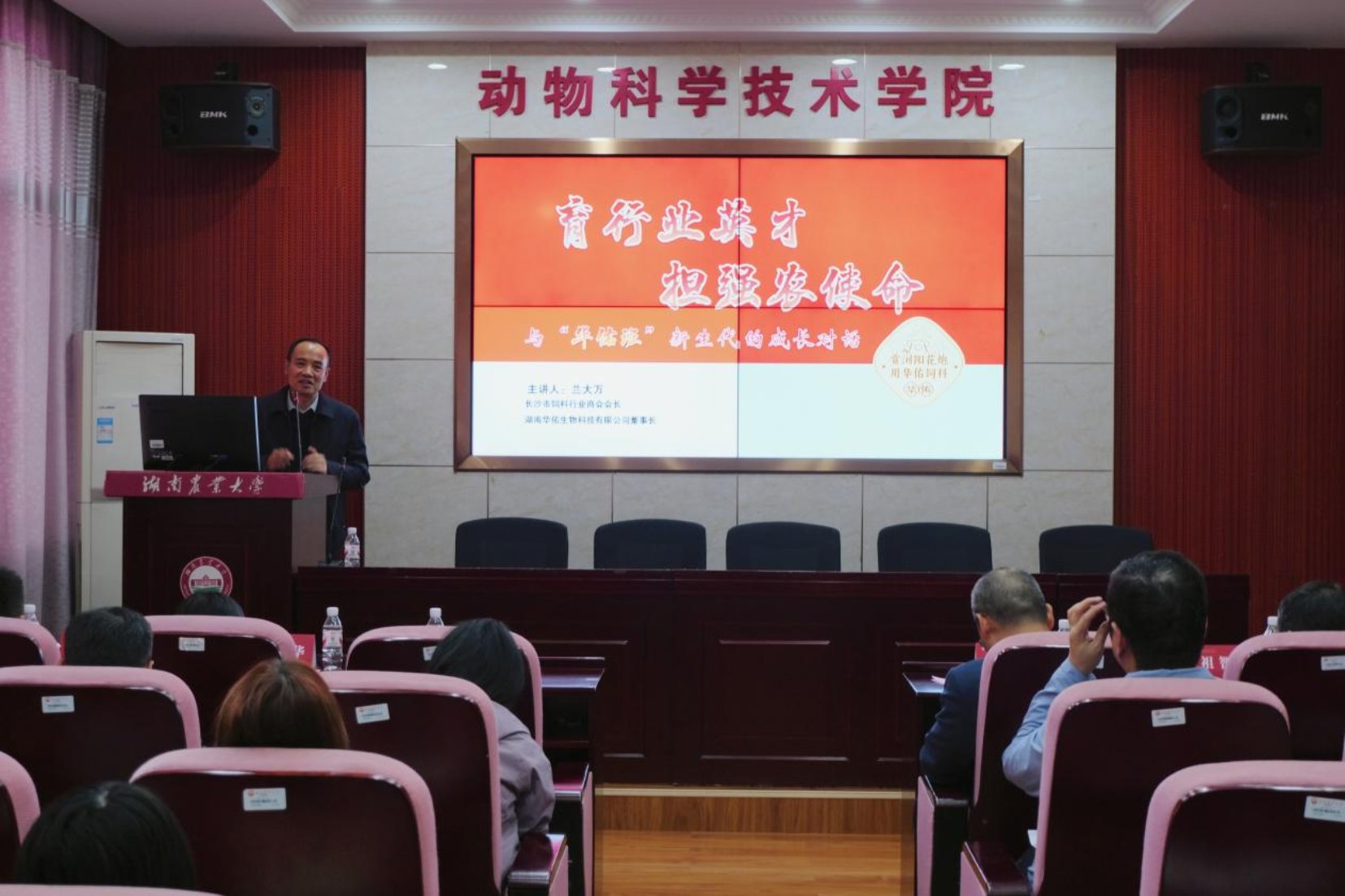 在第一届“华佑班”第一次授课环节,兰大万以《育行业英才,担强农使命——华佑与农大华佑班的时代交响》为题,从“校企缘分”“行业趋势”“人才成长路径”“企业承诺”四个维度展开分享。他介绍了华佑生物“丰华五谷,福佑六畜”的企业文化与“成为老百姓最喜欢的饲料品牌”的愿景,结合行业现状指出,南方地区反刍料配方师等人才缺口显著,鼓励学员夯实基础、提升格局。同时,他承诺企业将为“华佑班”提供实践参观、专家讲座、校外导师指导等资源,与校方共同打造体系化育人模式。