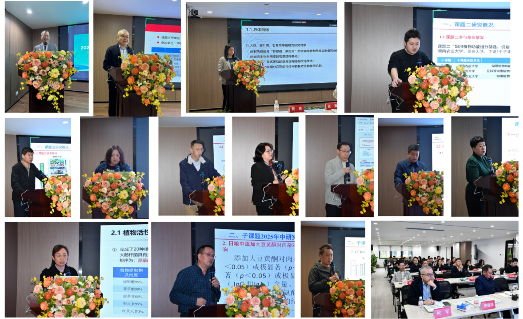 项目汇报环节,项目首席贺喜教授首先就项目和课题四总体执行情况、重要进展及后续计划进行了系统汇报。随后,课题一《植物功能组分生物效应评价与作用机制研究》负责人何军教授,重点汇报了功能组分的生物学效价评定及其作用机理方面的探索;课题二《饲用植物功能组分筛选、识别、获取技术及数据库构建研究》负责人黄鹏教授,深入介绍了组分高效筛选、识别技术与资源数据库的建设进展;课题三《植物提取物功能组分高效制备与定向改造关键技术研发与应用》负责人杨悠悠研究员,详细阐述了组分高效制备、纯化及定向改性等核心技术的研发突破;课题五《饲用天然植物功能组分制备与产品创制》负责人宋伟光经理则聚焦于技术集成与产品开发。此外,各子课题负责人也分别就具体研究内容进行了补充汇报。汇报显示,各课题均按计划稳步推进,在关键技术研发、机理探索和产品雏形构建等方面取得了阶段性重要进展。咨询专家组成员认真听取了汇报,并进行了质询和研讨。项目跟踪与咨询专家刘作华研究员、项目顾问曾建国教授等对项目已取得的进展给予了高度评价,认为项目组织有力,推进有序,成果初显。专家们强调,下一阶段应进一步聚焦饲用天然植物功能组分的高效利用与产业化应用,加强作用机制的深度解析;加快核心技术标准的制定,推动成果的规范化与推广应用;注重产品创制与实际饲喂效果验证,强化产学研用紧密结合,提升技术的实用性和经济性,为减少抗生素使用、保障饲料安全与畜产品安全提供强有力的科技支撑。