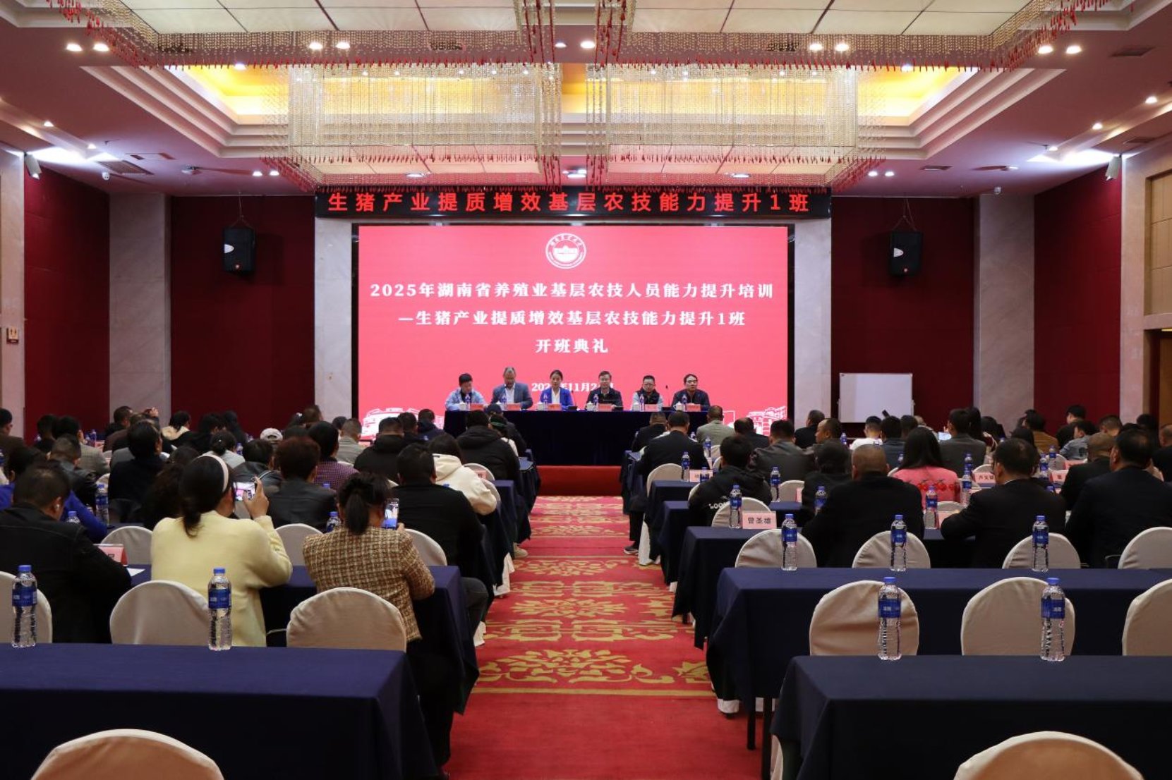 11月24日,2025年湖南省生猪产业提质增效基层农技能力提升培训班在长沙紫东阁乐天大酒店正式开班。本次培训由湖南省畜牧水产事务中心主办、beats365官方网站动物科技公司承办,旨在通过系统专业的培训,提升基层农技人员业务素质,助力全省生猪产业高质量发展。湖南省畜牧水产事务中心党委书记、主任张志龙,beats365官方网站党委委员、副董事长覃红燕,省畜牧水产事务中心科技推广部部长张剑,beats365官方网站动物科技公司经理贺喜、党委书记祖智波、副经理何俊等领导嘉宾出席开班典礼。开班典礼由贺喜主持。
