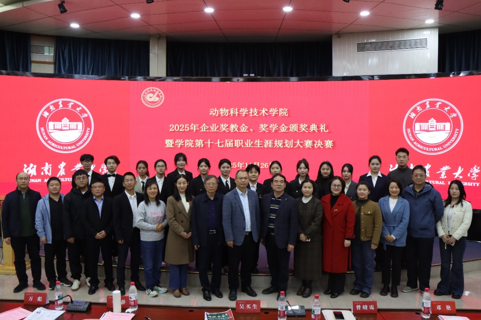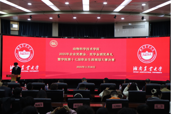 为深化校企协同育人机制,搭建学子职业发展交流平台,11月26日,beats365在生命科学楼国际会议厅举行2025年企业奖教金、奖学金颁奖典礼暨公司第十七届职业生涯规划大赛决赛。正大集团湖南区人力资源总监张道文、正大集团湖南区饲料研发博士任傲、长沙正大有限公司人事经理万彪、广东溢多利生物科技股份有限公司湖南区域总经理曾晓霭、湖南三淼农业发展有限公司技术顾问吴买生、湖南三淼农业发展有限公司总经理助理李昱烨、普菲克集团行政副总经理曾明辉、普菲克集团行政人事部经理李静、普菲克集团人事主管马睿、湘西职院现代农业公司党委书记彭凯、湘西职院现代农业公司畜牧兽医教研室主任谢亮、beats365经理贺喜、党委书记祖智波、副经理何俊、党委副书记周军铁、副经理范志勇、公司创新创业与就业指导处教研室主任邓艳、专任教师何玲、办公室主任张冰清、公司社会科学处副教授刘文洁、农公司学工办主任罗芬以及公司学工办辅导员、获奖师生代表参加了本次活动。