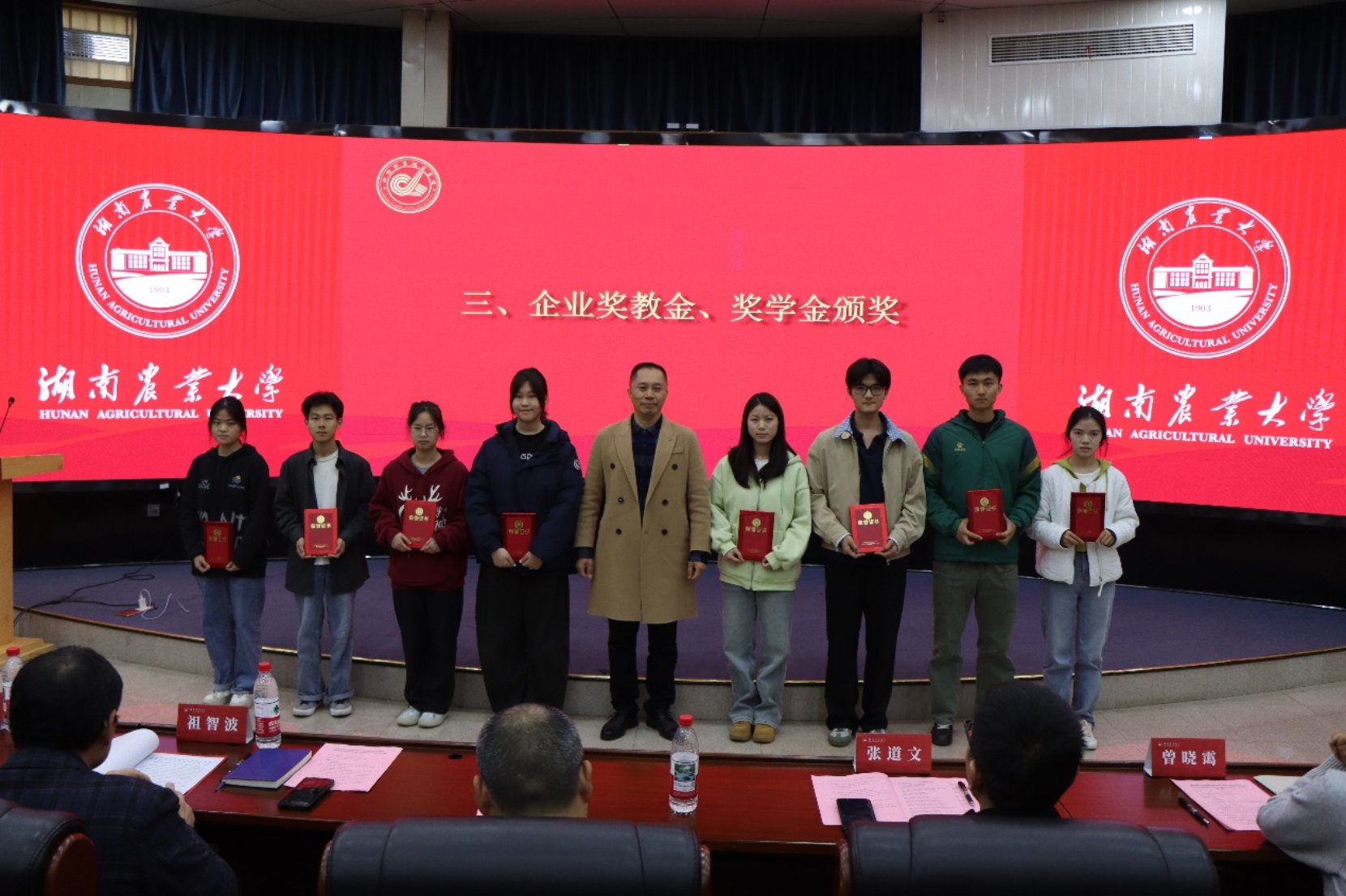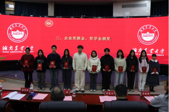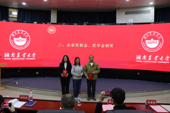 企业奖学金获奖员工代表进行发言。他们分享了在学习、科研与社会实践中的积极探索,并纷纷表示将以企业创新、责任、价值、共享的精神为指引,努力成为兼具专业能力与家国情怀的农科学子,未来回馈行业、传递爱心。