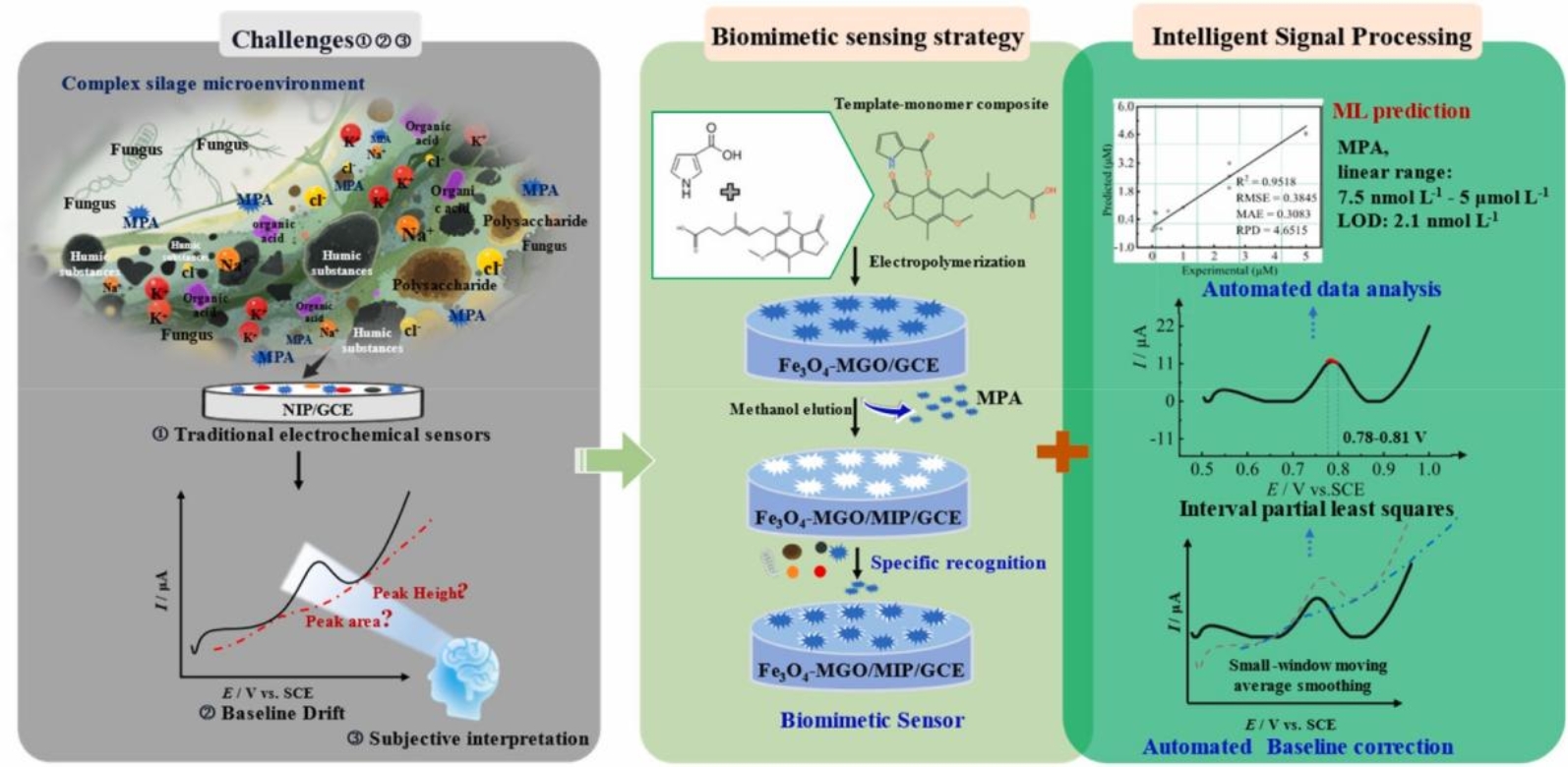 本研究将分子印迹识别与机器学习算法用于霉菌毒素电化学检测,解决复杂基质信号漂移与主观判读偏差难题,为构建青贮饲料安全监控智能传感提供了可靠技术路径,助力畜禽健康、饲料质量安全与农业检测技术智能化发展。