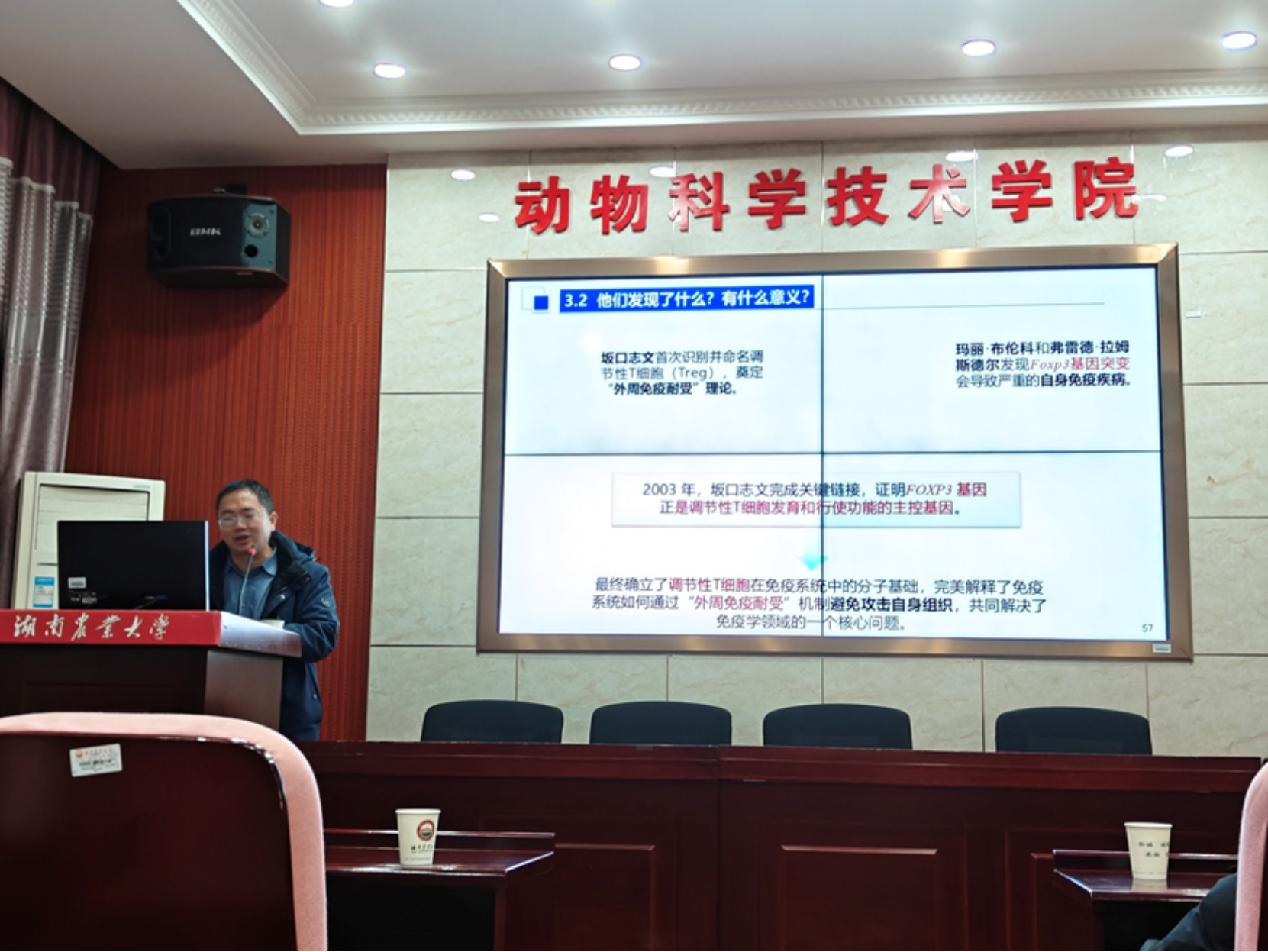 蓝贤勇教授围绕免疫耐受机制展开讲解,重点阐述调节性T细胞(Treg)的核心调控作用及FOXP3基因的关键功能,深入解读免疫系统“清除病原体同时避免攻击自身组织”的精密机制,为动物疾病精准防控策略制定及新型疫苗研发提出新理论。