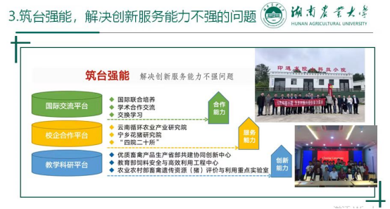(2)实践中取得关键突破。通过“立志爱国兴牧、树立劳模榜样、创办英才讲坛”激发员工热爱服务产业;通过“学术圈、产业圈、国际圈”,建立“创新学堂、移动学堂和拔尖学堂”夯实专业理论;通过“教学科研平台、校企合作平台、国际交流平台”培养创新服务能力。取得“立心、厚识、强能”人才培养实践关键突破。