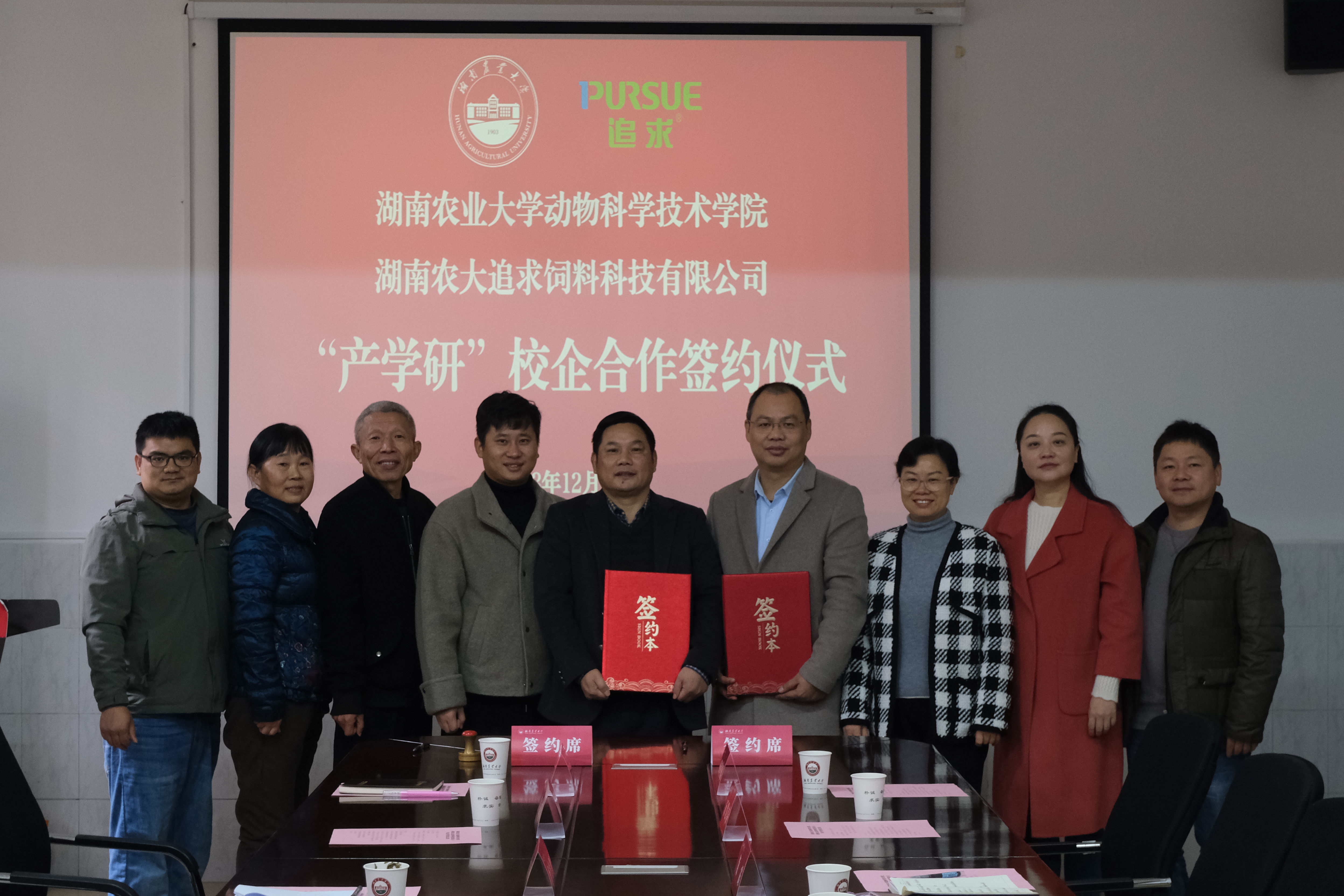 签约完成后,贺喜为追求饲料公司授“产学研校企合作”牌,全场鼓掌祝贺双方达成共赢协议。