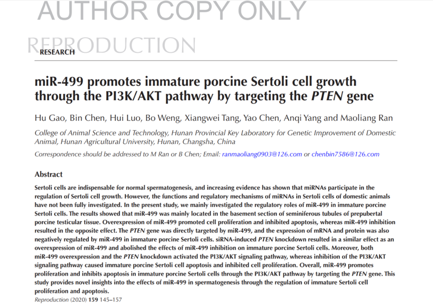 最近,陈斌教授课题组基于前期组织水平的RNA-seq和细胞水平的HCS筛选结果研究了miR-499对猪未成熟支持细胞增殖和凋亡的影响。结果表明:1)过表达miR-499或抑制表达PTEN基因促进猪未成熟支持细胞周期进程和增殖而抑制细胞凋亡;2)双荧光素酶报告基因实验证实miR-499靶向PTEN基因3'-UTR特异性位点,并抑制PTEN基因的翻译过程;3)补偿实验表明PTEN基因可拮抗miR-499对猪未成熟支持细胞增殖和凋亡的影响;4)miR-499和PTEN基因均能促进PI3K/AKT信号通路中主要基因磷酸化;5)采用LY294002抑制PI3K/AKT信号通路活性后,细胞周期进程和增殖受到抑制,凋亡率显著增加。以上研究结果以miR-499 promotes immature porcine Sertoli cell growth by the PI3K/AKT pathway by targeting the PTEN gene为题发表于Reproduction杂志,全文链接:https://doi.org/10.1530/REP-19-0303。