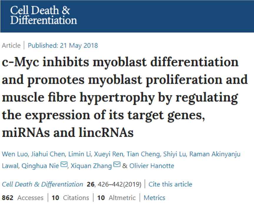 (c-Myc inhibits myoblast differentiation and promotes myoblast proliferation and muscle fibre hypertrophy by regulating the expression of its target genes, miRNAs and lincRNAs,Cell Death and Differentiation,doi.org/10.1038/s41418-018-0129-0)