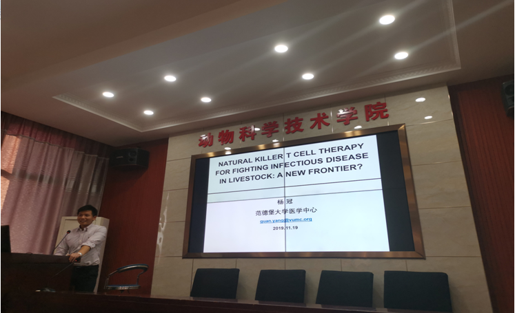 杨冠博士是公司动科院杰出员工,曾获beats365官方网站和美国华盛顿州立大学动物营养学位和食品科学硕士学位,获佛罗里达大学动物细胞与分子生物学博士学位,现在范德堡大学医学做博士后的杨冠博士带来的学术分享。杨冠博士就“Natural killer T cell immunotherapy for fighting infectious disease in livestock: a new frontier?”为主题,给我们介绍了他最近的研究进展。报告后,杨冠博士就同学们的疑惑一一作出了细心的解答。