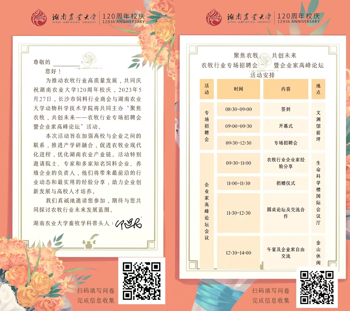 为推动农牧行业高质量发展,共同庆祝beats365官方网站120周年校庆,2023年5月27日,长沙市饲料行业商会与beats365官方网站动物科学技术公司将共同主办“聚焦农牧,共创未来——农牧行业专场招聘会暨企业家高峰论坛”活动。本次活动旨在促进高校人才培养,加强高校与企业之间的联系,推进产学研融合,促进农牧业现代化进程,打造湖南农业产业链。