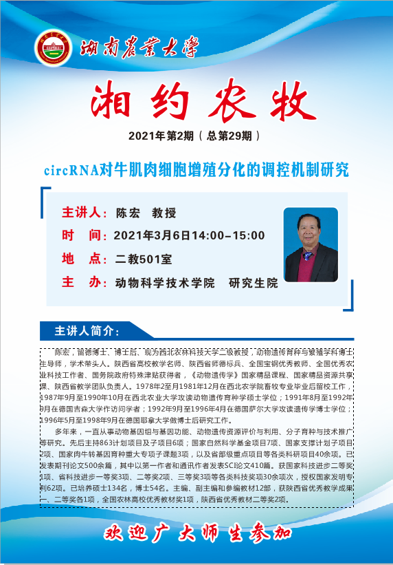 报告人简介: 主讲人简介: 陈宏,现为西北农林科技大学二级教授,动物遗传育种与繁殖博士生导师,学术带头人。陕西省高校教学名师,陕西省师德标兵,全国宝钢优秀我师,全国优秀农业科技工作者,园务院政府特殊津贴荻得者,《动物遗传学》国家精品课程。陕西省教学团队负责人,1978年2至月1981年12月在西北农公司香牧专业毕业后留校工作 2987年9月至1990年10月在西北农业大学攻读动物遗传育种学硕士学位:1991年8月 至1992年9月在德国吉森大学作访向学者:1992年9月至1996年4月在德国萨尔大学攻读遗传学博士学位,1996年5月至1998年9月在德国耶拿大学做博后研究工作。