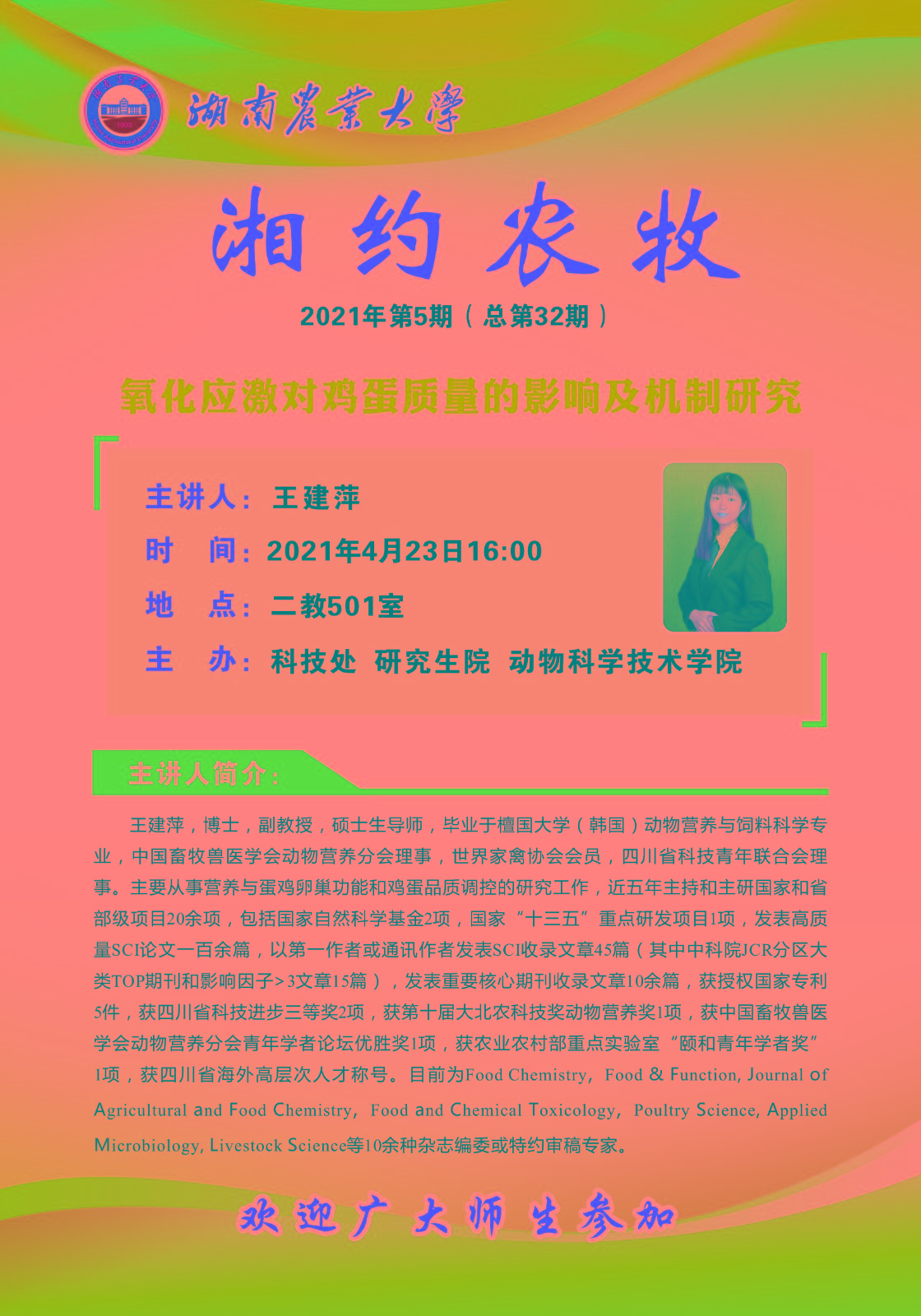 报告人简介: 王建萍,博士,副教授,硕士生导师,毕业于檀国大学(韩国〕动物营养与饲料科学专业,中国畜牧兽医学会动物营养分会理事,世界家离协会会员,四川省科技青年联合会理事。主要从事营养与蛋鸡卵巢功能和鸡蛋品质调控的研究工作,近五年主持和主研国家和省部级项目20余项,包括国家自然科学基金2项,国家“十三五〞重点研发项目1项,发表高质量sCI文一百余篇,以第一作者或通讯作者发表SC1收录文 章45篇(其中中科院JCR分区大类TOP期刊和影响因子≥3文章15篇),发表重要校心期刊收录文章10余篇,获授权国家专利5件,获四川省科技进步三等奖2项,获第十届大北农科技奖动物营养奖1项,获中国畜牧兽医学会动物营养分会青年学者论坛优胜奖1项,获农业农村部重点实验室“颐和青年学者奖"1项,获四川省海外高层次人才称号。目前为Food Chemistry, Food & Function, Journal ofAgricultural and Food Chemistry, Food and Chemical Toxicology, Poultry Science, AppliedMietobiology, Livestock Science等10余篇。