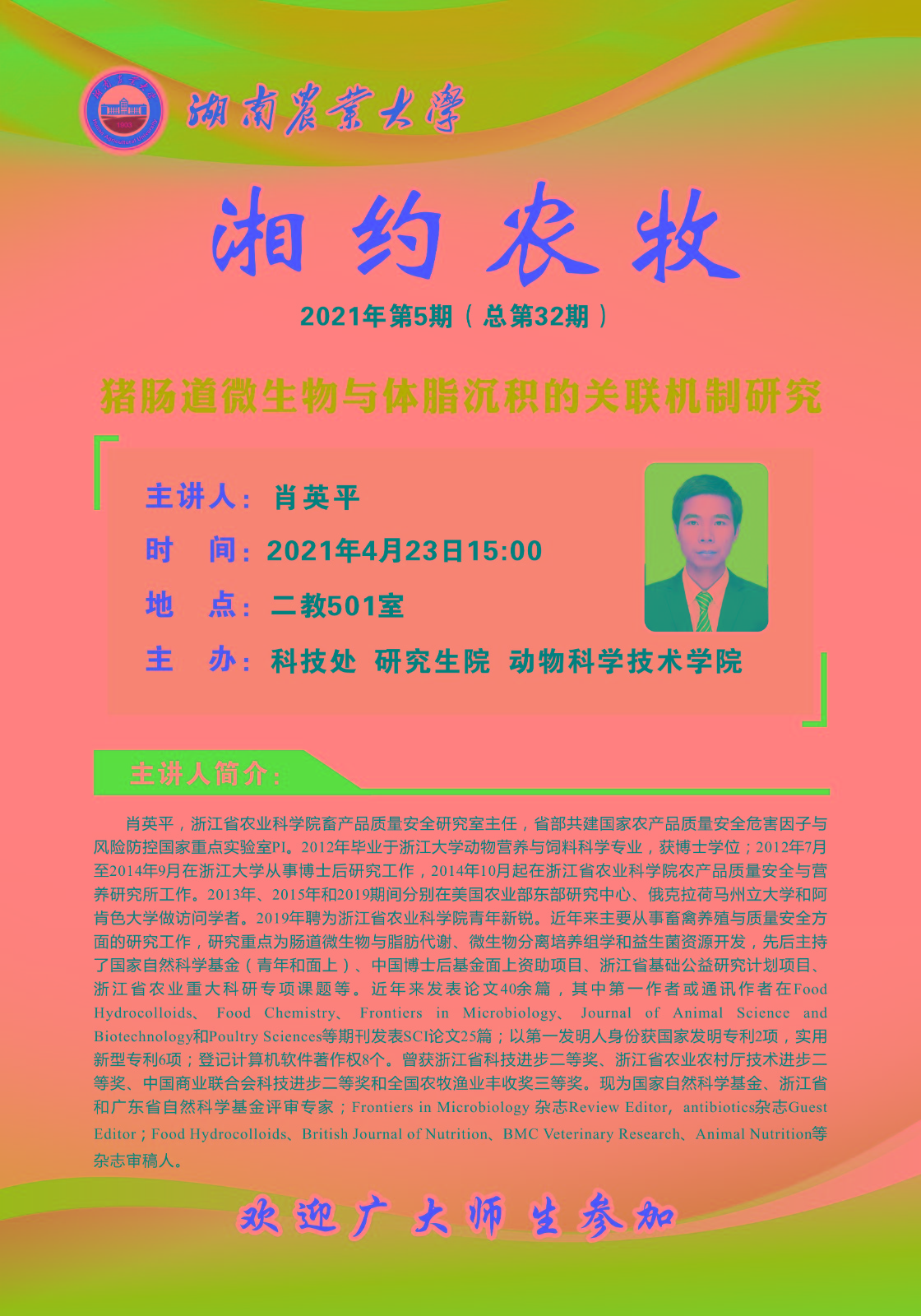 报告人简介: 肖英平,浙江省农业科公司畜产品质量安全研究室主任,省部共建国家农产品质量安全危害因子与风险防控国家重点实验室P1。2012年毕业于浙江大学动物营养与饲料科学专业,获博士学位:2012年7月至2014年9月在浙江大学从事博士后研究工作,2014年10月 起在浙江省农业科公司农产品质量安全与营养研究所工作。2013年、2015年和2019期间分别在美国农业部东部研究中心、俄克拉荷马州立大学和阿肯色大学做访问学者。2019年聘为浙江省农业科公司青年新锁。近年来主要从事畜禽养殖与 质量安全方面的研究工作,研究重点为肠道微生物与脂肪代谢、微生物分离培养组学和益生菌资源开发,先后主持了国家自然科学基金(青年和面上)中国博士后基金面上资助项目、浙江省基础公益研究计划项目、浙江省农业重大科研专项课题等。近年来发表论文40余篇,其中第一作者或通讯作者在Food Hydrocolloids、Food Chemistry、Frontiersin Microbiology.Journalof Animal Science and Biotechnology和Poultry Sciences等期刊发表SCI论文25篇;以第一发明人身份获国家发明专利2项,实用新型专利6项:登记计算机软件著作权8个。曾获浙江省科技进生一等奖、浙江省农业农村厅技木进步二等奖.中国商业联合会科技进步二等奖和全国农牧渔业丰收奖三等奖。现为国家自然科学基金、浙江省和广东省自然科学基金评审专家;Frontiers in Microbiology 杂志Review Editor, antibiotics杂志Guest Editor ; Food Hydrocolloids、British Joumal of Nutrition BMC Veterinary Research、Animal Nutrition等杂志审稿人。