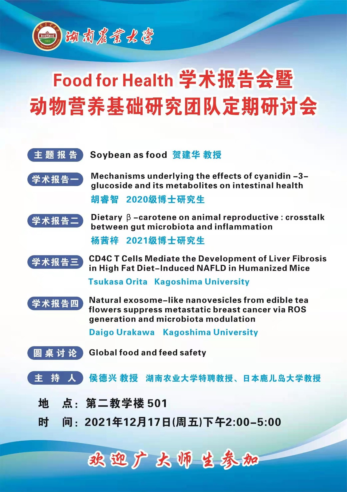beats365学术报告会邀请了贺建华教授作主题汇报,胡睿智2020级博士研究生关于“Mechanisms underlying the effects of cyanidin-3- glucoside and its metabolites on intestinal health”进行了学术交流,杨茜梓 2021级博士研究生究生关于“Dietary ß -carotene on animal reproductive : crosstalk between gut microbiota and inflammation”进行了学术交流,Tsukasa Orita Kagoshima University员工关于“Cells Mediate the Development of Liver Fibrosis in High Fat Diet-Induced NAFLD in Humanized Mice”进行了学术交流,Daigo Urakawa Kagoshima University员工关于“Natural exosome-like nanovesicles from edible tea flowers suppress metastatic breast cancer via ROS generation and microbiota modulation”进行了学术交流。