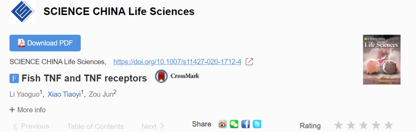 肿瘤坏死因子(Tumor necrosis factor,TNF)是参与调节脊椎动物多种生理活动的一类细胞因子,TNF通过结合对应结构相关的肿瘤坏死因子受体来实现其功能。鱼类因为基因组复制事件而拥有多样化且复杂的TNF家族及其受体系统,总体上与哺乳动物同源,但拥有自身的独特性。为充分了解鱼类TNF及其受体系统的功能地位,公司教师在Science China Life Sciences期刊上发表最新关于鱼类肿瘤坏死因子及其受体的研究综述;论文第一作者为李耀国博士,通讯作者为肖调义教授及邹钧教授(http://engine.scichina.com/doi/10.1007/s11427-020-1712-4)。