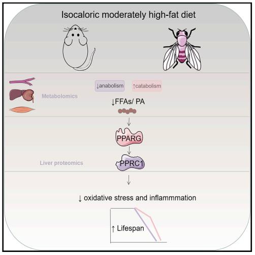 高脂饮食对健康的影响一直是公共卫生领域最令人烦恼的问题之一。其实脂肪的负面影响主要来源于过量的能量摄入,那么如果能控制总能量,多摄入脂肪会有什么不良影响吗?之前,有两项研究都是在控制总能量的情况下,分别采用60%和90%由脂肪提供能量的饮食作为试验组,证明了高脂饮食对健康的潜在益处,但试验持续时间相对较短,或者是脂肪比例极高,无法说明更加适度比例的高脂饮食对健康的长期影响。哈尔滨医科大学公共卫生公司孙长颢教授团队经过深入研究,发现在摄入总能量相等的条件下,相比正常饮食,适度高脂饮食有助于改善炎症和氧化应激,并且可以延长寿命。1.他们将90只大鼠分为3组,按照正常的随意饮食(对照组)、等热量适度高脂饮食(IHF,35%热量来自脂肪)和高脂随意饮食(FHF)喂养2年,发现IHF组大鼠有更长的寿命和健康寿命;另外在对衰老有关的一系列生物标志物进行检测后,发现IHF可以减少炎症和氧化应激。2.对参与脂肪代谢的几种酶进行测定后,发现IHF通过减少游离脂肪酸(FFA)合成代谢和增加其分解代谢来降低血清和多个组织中的FFA分布,并且只有棕榈酸(PA)在血液和各个组织中都减少。游离脂肪酸对炎症和氧化应激都有促进作用,因此,减少总的和特定类型的游离脂肪酸可能是IHF减少炎症和氧化应激的关键。3.对大鼠肝脏进行蛋白组学分析后,进一步验证了上述结果,同时发现IHF显著上调过氧化物酶体增殖激活受体-γ辅激活因子1(PPRC1)蛋白,并且PPRC1的表达与PA水平呈强负相关性。4.在果蝇中,研究人员也观察到了IHF同样的作用。5.通过构建PPRC1转基因果蝇(RNAi和overexpression)及进行体外试验(HepG2 cells),发现IHF可以显着降低PA,然后在PPARG的介导下,上调PPRC1水平,从而改善氧化应激和炎症反应并延长寿命。6.最后,评估了人类肝脏PPARG/PPRC1与年龄的关系,发现PPARG和PPRC1的表达水平与肝组织中ROS、total FFAs、PA以及年龄均呈负相关关系,这为人类衰老和氧化应激相关疾病寻找了潜在治疗靶点。以上研究发表在Cell Metabolism杂志。全文链接:https://doi.org/10.1016/j.cmet.2020.12.017