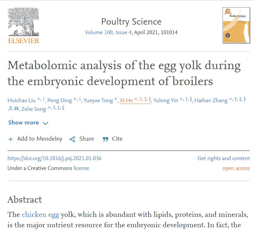 湘约农牧公司团队研究进展第11期:公司贺喜教授团队在肉鸡胚胎发育过程中卵黄的代谢研究取得新进展